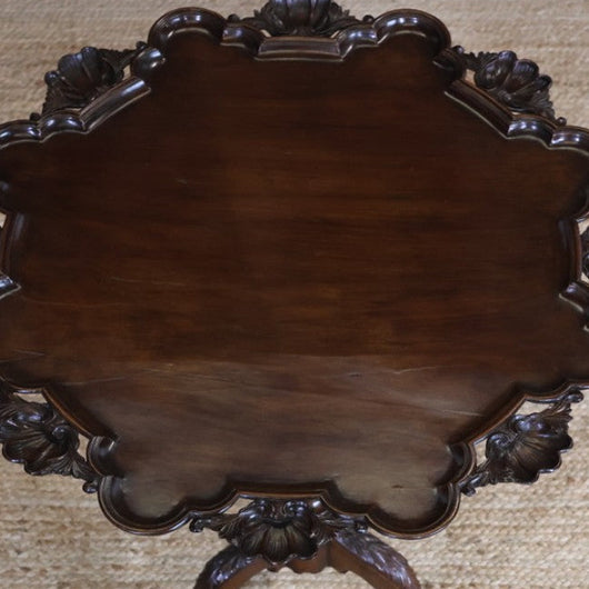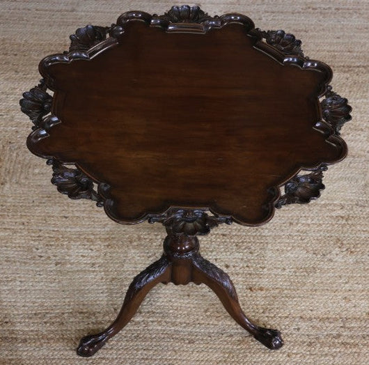 AN ENGLISH 18TH CENTURY GEORGE III TRIPOD TABLE WITH A PIE CRUST TOP WITH SCALLOP SHAPED DETAILS AND TRIFORM BASE.