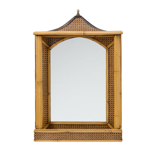 A MID 20THC BAMBOO AND RATTAN MIRROR WITH A PAGODA SHAPED TOP AND INTEGRAL SHELF TO THE BASE