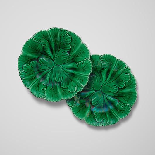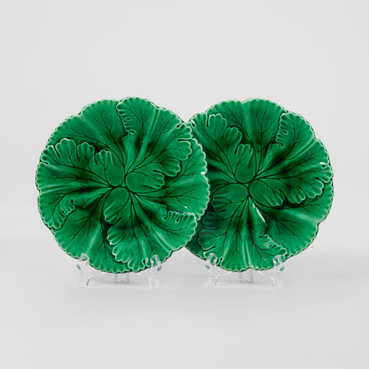 A SET OF SIX EARLY 20TH CENTURY FRENCH GREEN GLAZED LEAF PLATES.